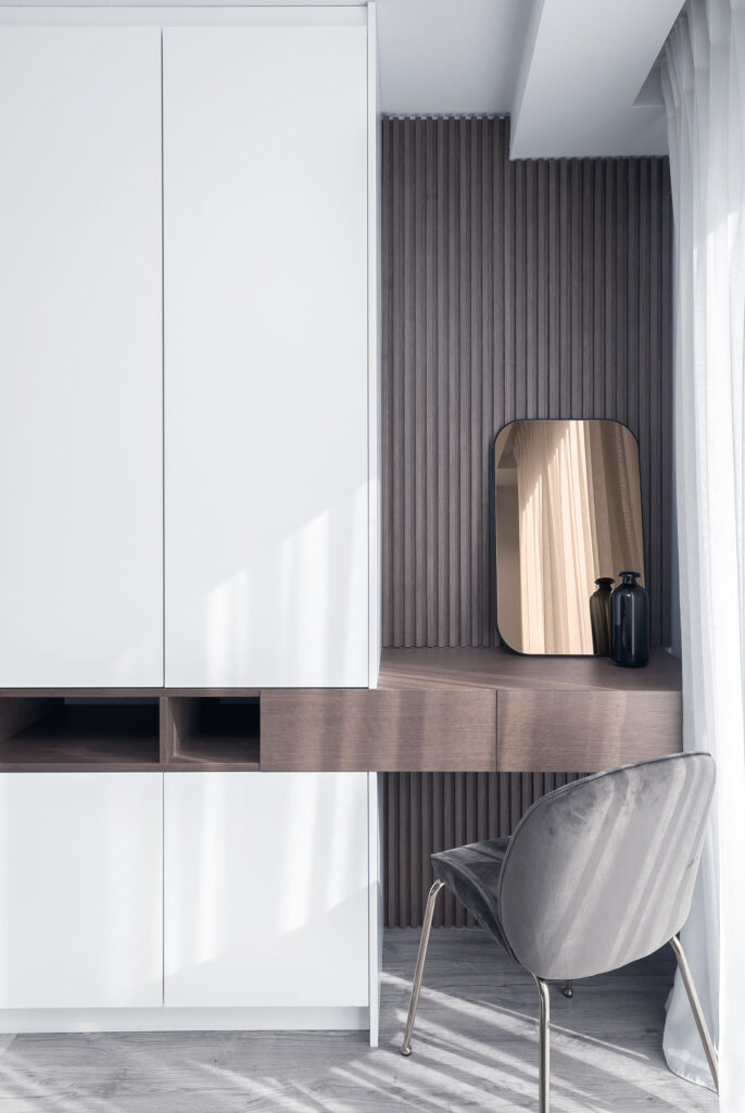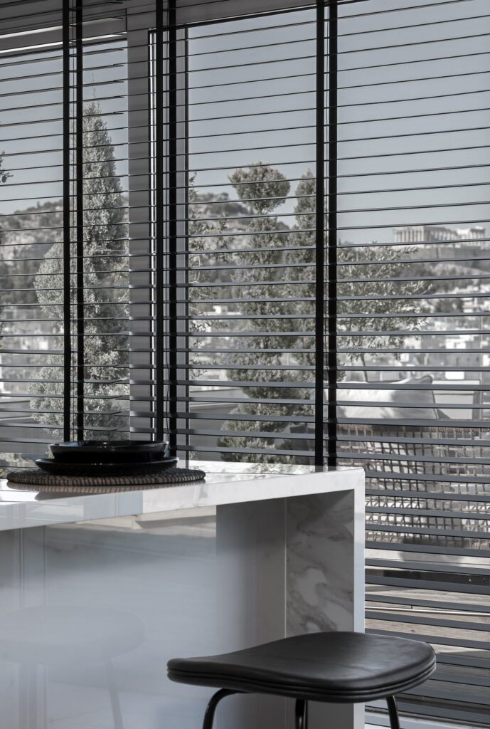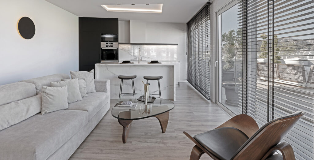 Finally, the metal suspension beams of the metal cladding participate in the morphological impression of the building structure by exposing the balconies and the windows. The interior of the building was completely stripped and designed from the beginning. The bearing structure and the openings created an original system of rooms and common areas, which maximizes the qualities of the building and minimizes its weaknesses. Our goal was to focus and maintain the remarkable and vital elements of the building. The central idea was inspired by the city of Athens, by creating a central "boulevard" and smaller side "streets", each of which leads to a room, ensuring privacy and sound insulation. The elements of wood, copper, mosaic, pastel but also earthy colors and furniture are key elements of the building structure which follows the architectural characteristics, the curves, and the repetitive patterns of the facade.